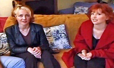 Two buxom and wild German women sharing two hard peckers in the living room