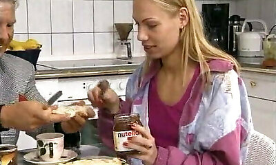 Stunning German girl with blonde hair having joy with a old fellow
