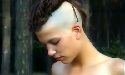 Skinny and tall punk girl with two naughty men in the woods