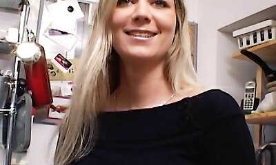 Impressive German MILF with large boobs dildoing her shaved muff in the kitchen